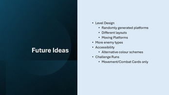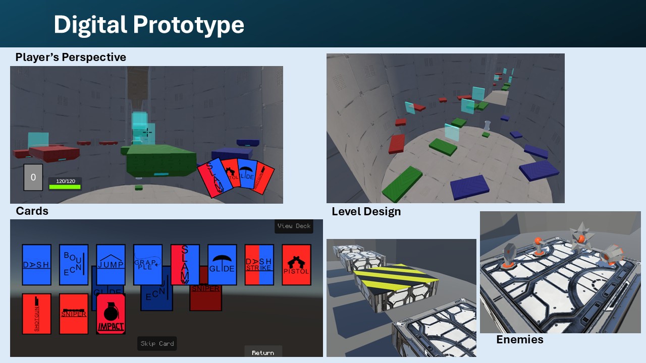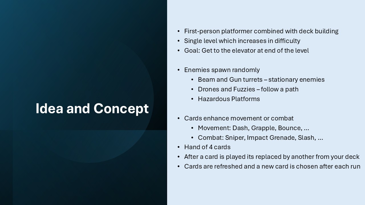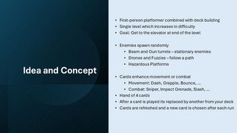 The basic controls are moving with w,a,s,d looking with the mouse. Cards are played by scrolling to them with the mouse screen and left clicking or using the 1,2,3, or 4 key for the 4 respective cards. There are 2 types of cards, movement and combat plus some rare card which are both When a card is used it is expended (or for a combat card has its ammo decreased till 0) Enemies can be killed for points and completing a run also awards you 50 points. Get as high a score as possible. Enemies will attack you if you get close, and dangerous terrain will damage you over time. If you fall during certain sections of the level, there are wind tunnels to get you back up.